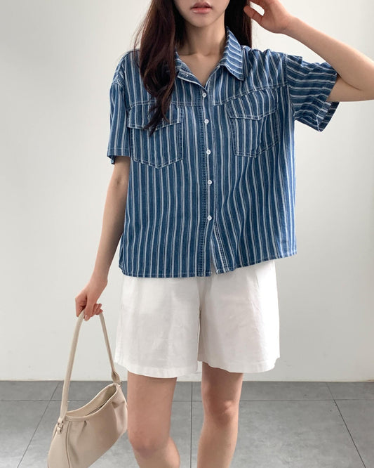์คํธ๋ผ์ดํ ์ฒญ ๋จ๋ฐฉ (Stripe Denim Shirt)